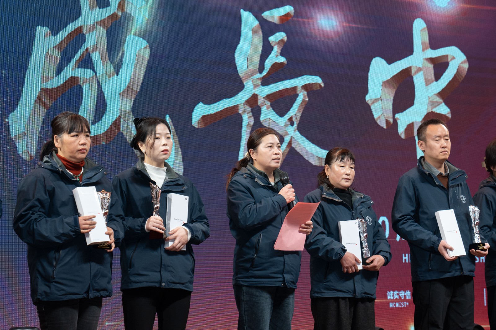 “功勛基石·15年堅守獎”率先揭曉,裝卸員謝紅舉、常務副總朱文浩等12位老員工獲此殊榮。十五載春秋流轉,他們與恒銘風雨同舟、不離不棄,將最寶貴的青春年華奉獻給恒銘,用日復一日的堅守,筑牢企業(yè)發(fā)展的堅實根基。緊隨其后,“成長中堅·10年深耕獎”隆重揭曉,劉俊蘋、張小娟等22位員工憑借十年深耕和初心不改,成為企業(yè)發(fā)展的核心力量。董事長和夫人親自上臺頒獎,與獲獎員工合影留念。老員工代表李三衛(wèi)、夫妻員工代表楊撫修、10年員工代表曹雪霞先后發(fā)言,字里行間滿是對恒銘的深情與眷戀,真摯的分享打動了在場每一個人。